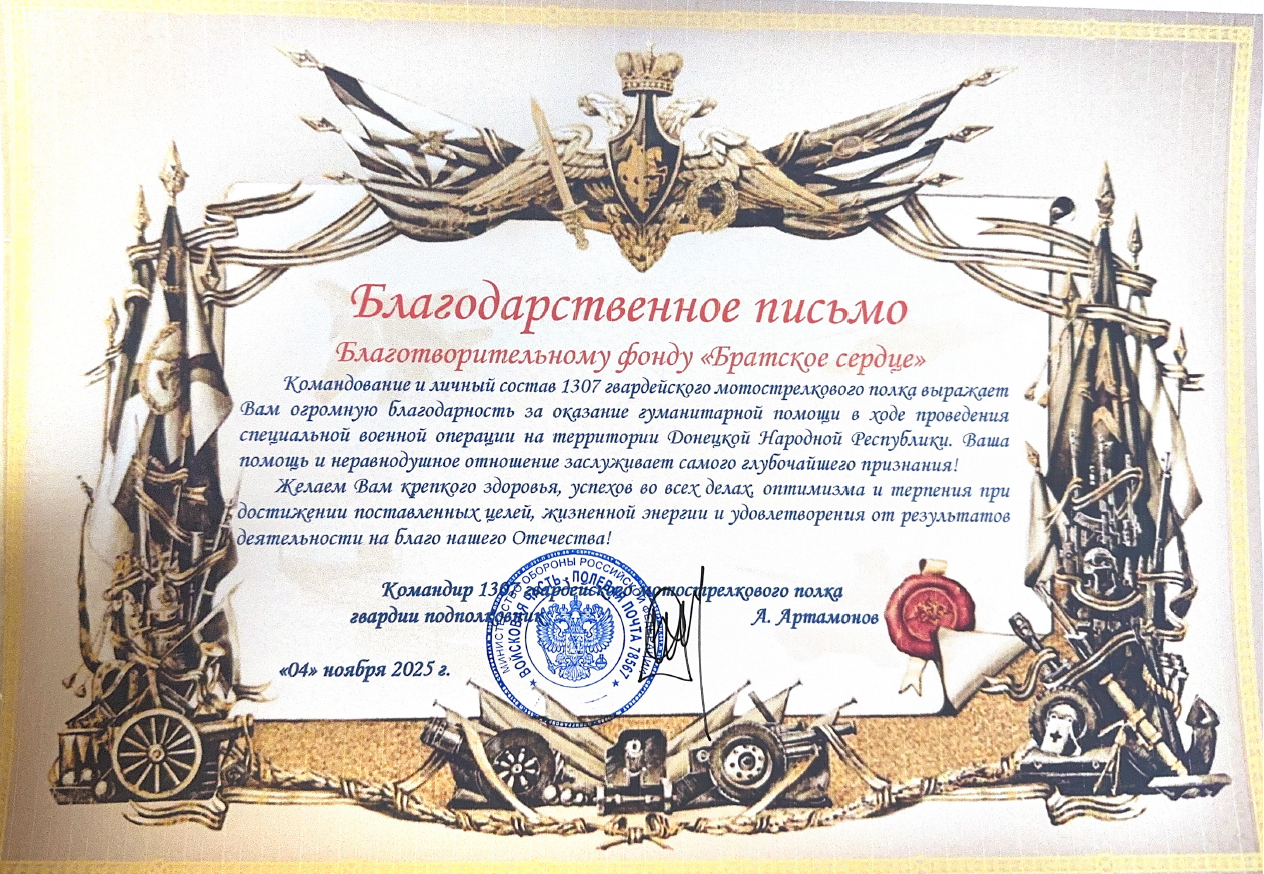 Благодарность благотворительному фонду от командира и личного состава войсковой части 1307